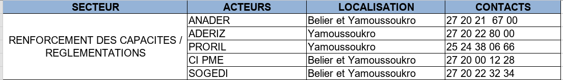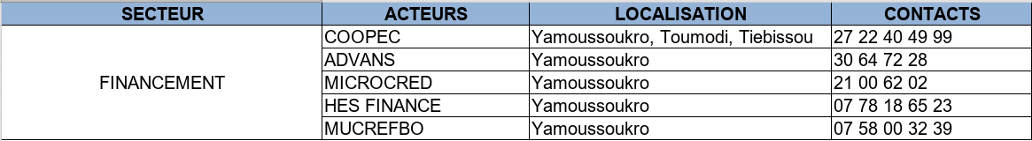 Financement & Soutiens Les structures de soutien pour le développement des chaînes de valeur des filières ciblesdu projet et les differentes sources de financement. Structures de financement Structures techniques
